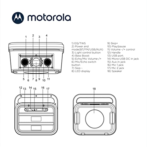 Specificaties: Motorola Sound ROKR 810 – Draadloze luidspreker – 40 Watt – Bluetooth 5.0 – LED – Karaokemicrofoon – Waterdicht – Zwart
